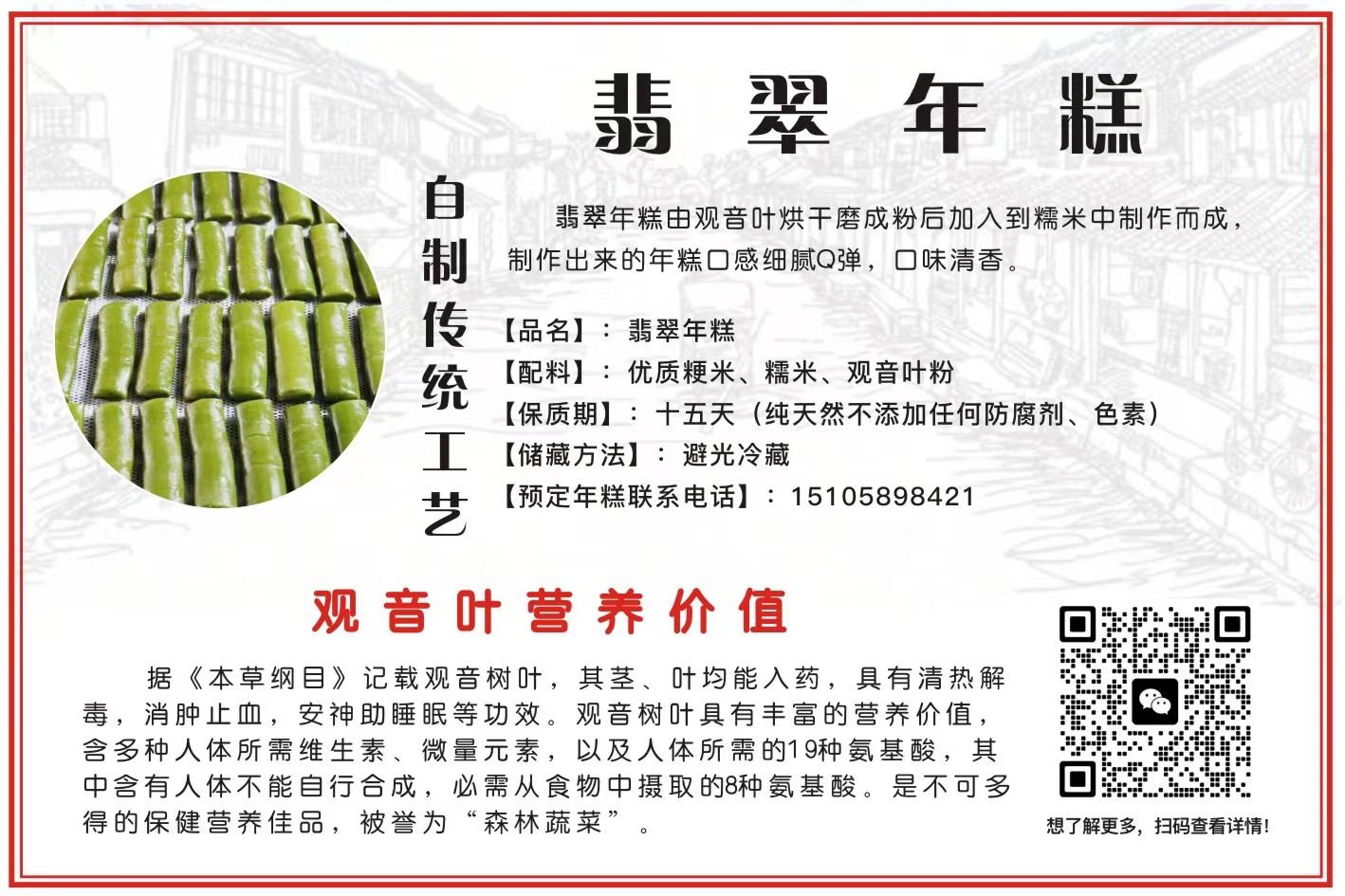 翡翠年糕由观音叶烘干磨成粉后加入到糯米中制作而成,制作出来的年糕口感细腻Q弹,口味清香。 【品名]..